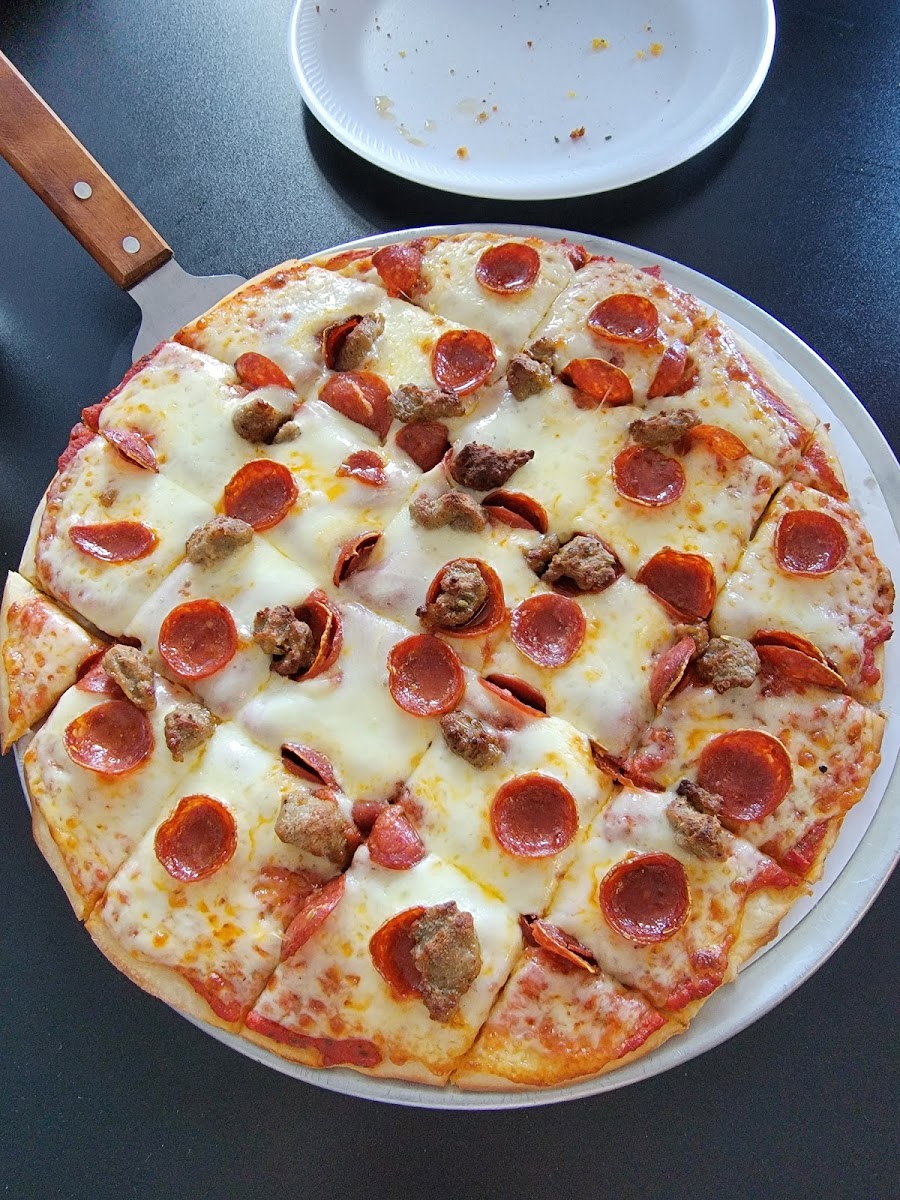 We ate here for dinner and when I walked in the aroma of delicious pizza came over me, It reminded me of my childhood. The mushroom appetizer was crispy and fresh. We also had their breadsticks, warm with a light buttery garlic drizzle. Our 12 inch pizza was amazing, curled pepperoni and with small chunks of sausage.